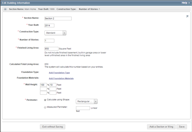 First you must enter the percentage of the home that the wall height applies to, and then enter the actual wall height in feet between 7.0 and 40.0. The total percentages must equal 100%.