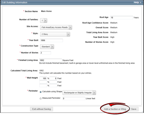 Use the Edit Building Information dialog to add sections or wings. The Section (or wing) feature of RCT offers the ability to capture unique parts of a home that may differ from the Main Home. Sections often account for but are not limited to additions, differences in the number of stories or unique floor plans. RCT allows you to divide the home into the Main Home and section areas. Only use a section to account for additions if the addition has significant differences in age, material type or methods of construction. Sections may also be used for homes that have a different number of stories, whether an addition or not, when the portion is clearly identifiable from the main home and contains differing attributes. This can apply when the home has a significant difference in style between the Main Home and the Section or a difference in construction, such as slab versus basement. While sometimes subjective, the use of sections should be justifiable as a result of a characteristic being substantially different.