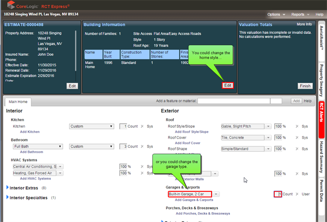 A situation could also exist where the error could be fixed in more than one place. For example, if a 1 story home style is selected and then a built-in garage is added, an error occurs. A 1 story home cannot have a built-in garage. So you could correct the error by either changing the home style or by changing the garage type. RCT Alerts will highlight both areas where the error could be fixed, in this case on the Building Information panel (Edit is highlighted to prompt you to open and edit that info) and on the materials panel where you can edit the garage type.