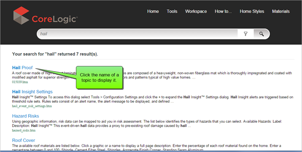 The results of the search appears below the search bar. For example, if you searched for "hail" the results would appear as shown below: